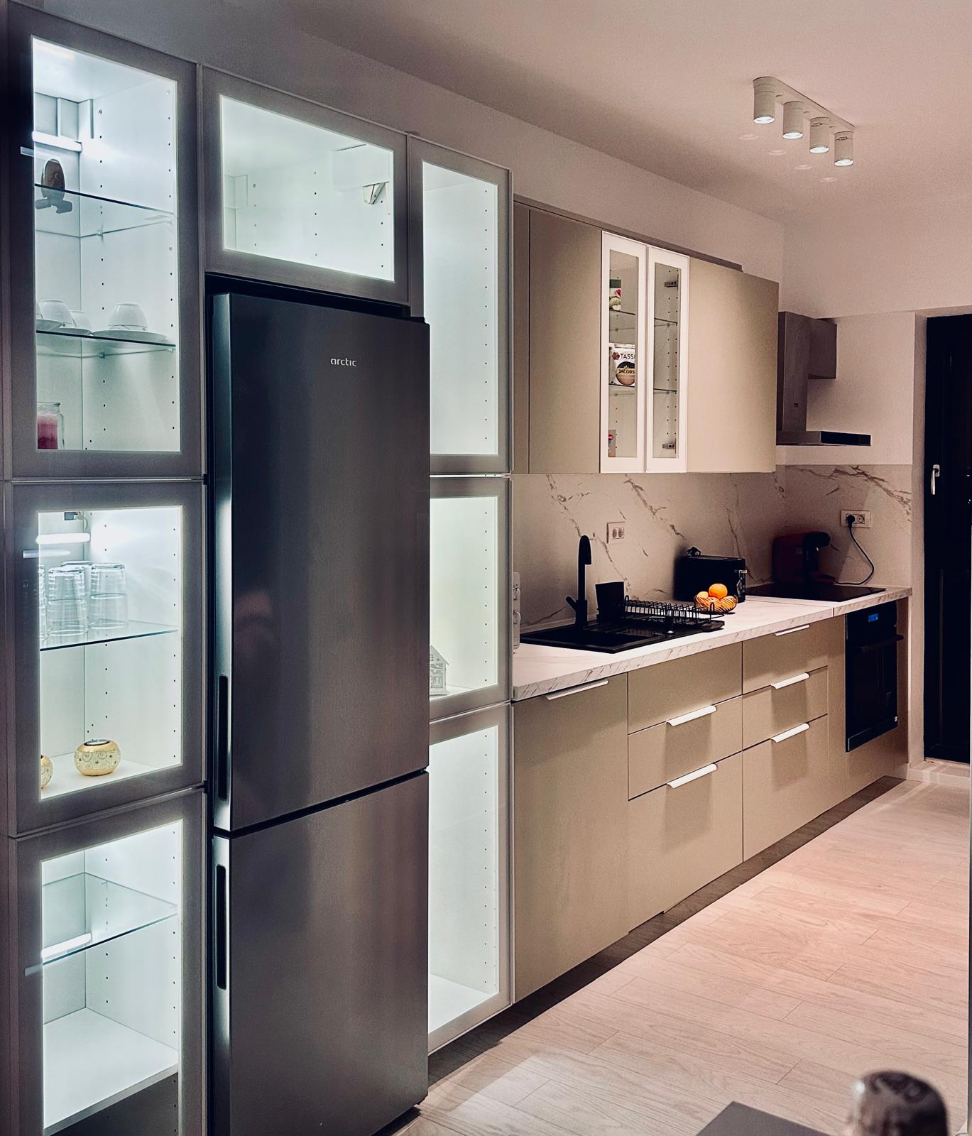 Echipare Completă, Calitate Superioară Apartamentul este dotat integral cu electrocasnice noi, premium: frigider, plită + cuptor, hotă, mașină de spălat vase, mașină de spălat rufe, cuptor cu microunde, toaster, expresor, aspirator, fier de călcat, AC, televizoare. Se închiriază complet mobilat și utilat, ready-to-move-in.