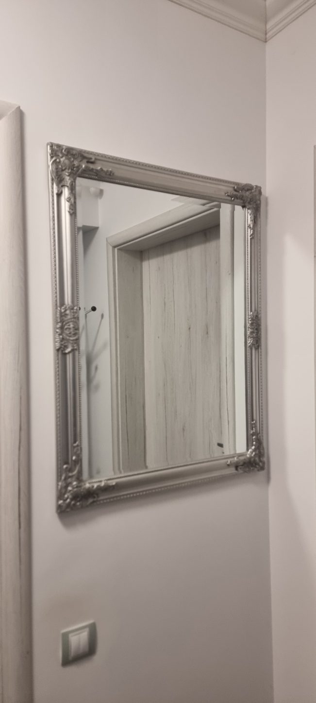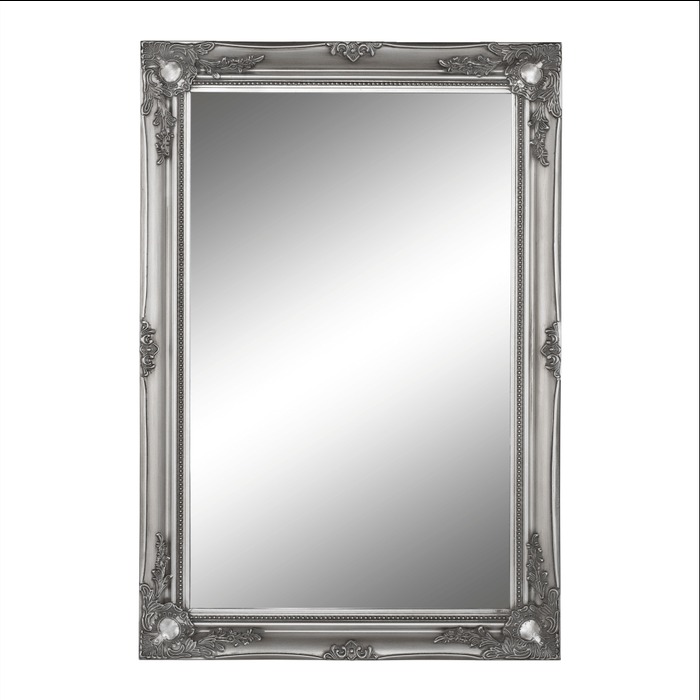 Această oglindă elegantă, cu dimensiunea de 64 x 94 cm, impresionează prin designul său clasic și sofisticat. Rama decorativă, finisată într-un ton argintiu antichizat, este ornamentată cu detalii florale și motive baroce, care adaugă un aer rafinat și atemporal. Este ideală pentru a completa un decor vintage, glamour sau clasic, aducând un plus de lumină și eleganță oricărui spațiu fie că este vorba de un dormitor, living, hol sau dressing.