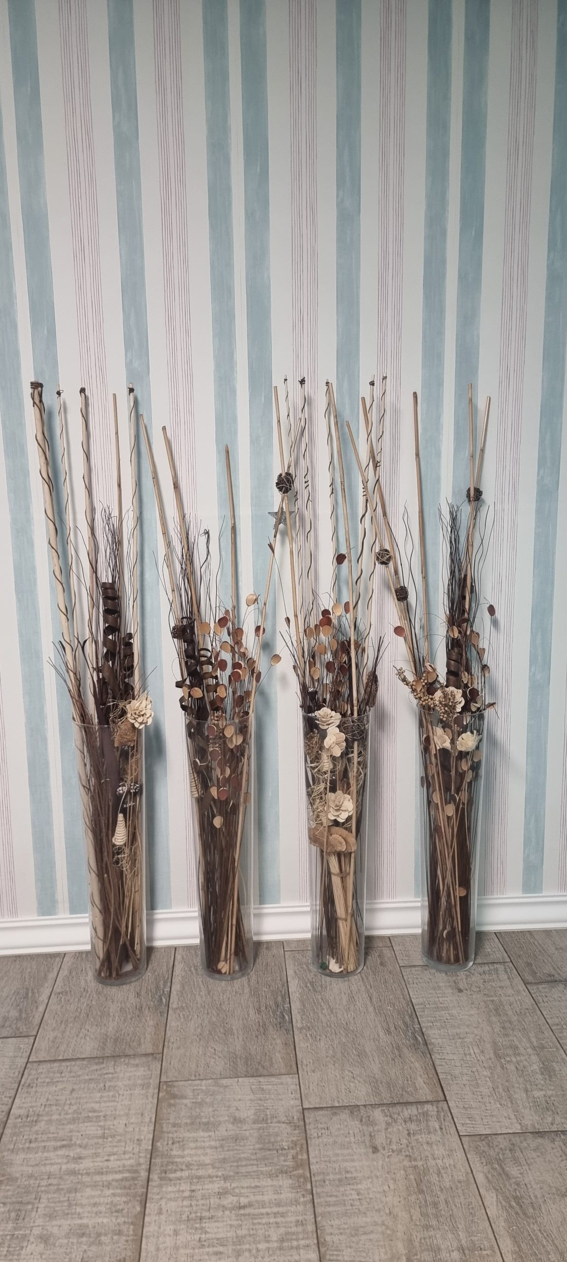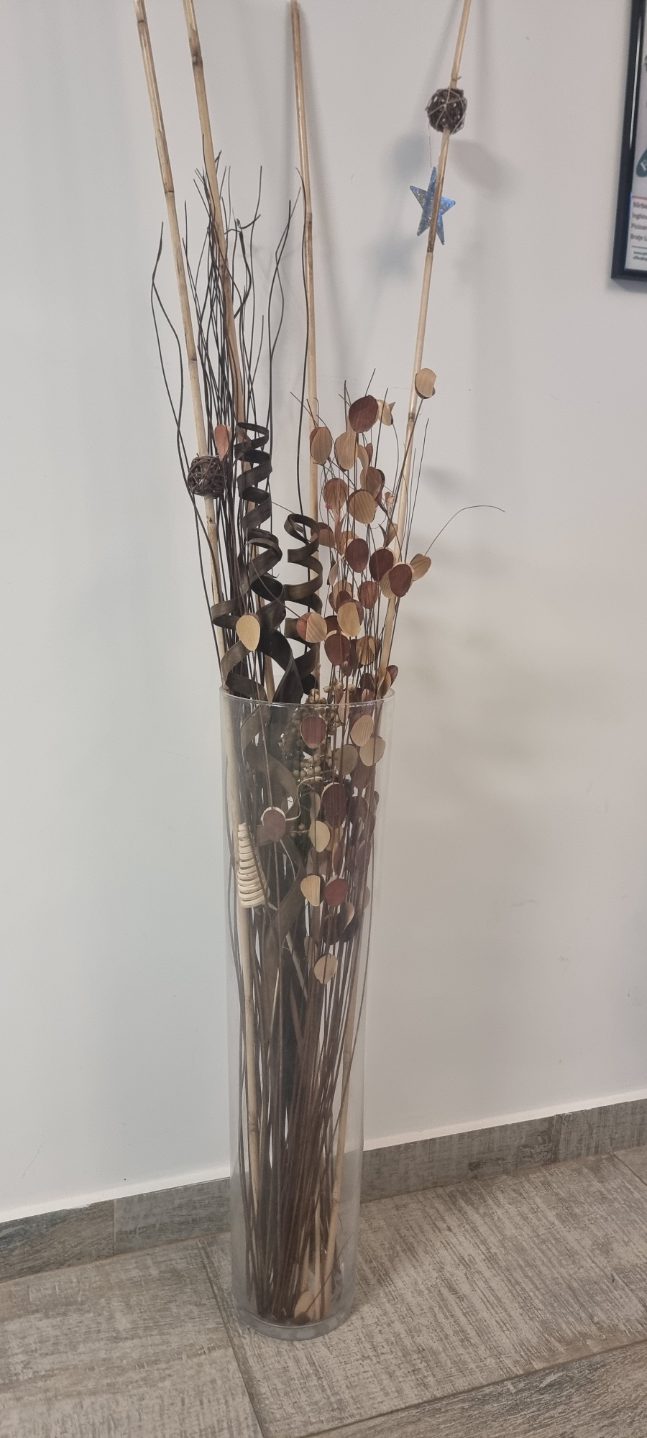Adaugă o notă de eleganță și natură în orice colț al casei tale cu această Vază din sticlă transparentă cu aranjament floral decorativ. Conținutul include o selecție armonioasă de elemente naturale uscate: flori artizanale, bețe decorative, spiralate și rotunde, frunze din lemn și detalii rustice – totul perfect echilibrat pentru a crea o atmosferă caldă și primitoare.